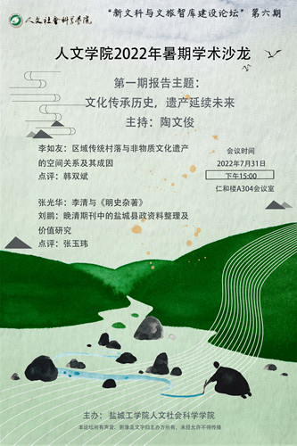 第一期学术沙龙主题为文化传承历史,遗产延续未来。湿地生态旅游研究中心主任李如友老师作了“区域传统村落与非物质文化遗产的空间关系及其成因”的主题报告,深入探讨了长江经济带与黄河流域传统村落与非遗分布空间错位格局的现状与形成机理;文化多样性与旅游发展研究中心的张光华教授分享了”李清与《明史杂著》”的独到思考,展示了历史学者史学、史才、史识的风范。刘鹏老师以“晚清期刊中的盐城县政资料整理及价值研究”为题,介绍了盐城晚清期刊中县政资料的基本概况与特点以及今后的研究方向,让大家感受到盐城历史的厚重与研究意义。三位老师的发言各具特色,韩双斌与张玉玮老师分别做了入木三分的精辟点评。整场活动互动热烈且深入,既有对理论热点和前沿的展望、又有睿智而深刻的学术思考。陶文俊副经理在总结时对汇报人的精彩发言及点评人的独到见解表示感谢,也对教师们在学术上的成长提出新的要求与希望。