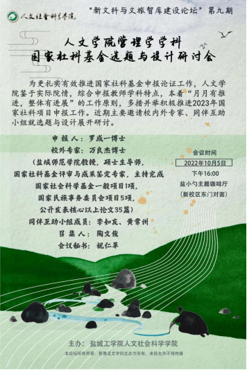 10月5日下午,bbin宝盈集团“2023年国家社科基金选题与设计”系列研讨会之“管理学”学科专场如期而至。会议由陶文俊副经理主持,周晓燕经理、湿地生态旅游研究中心主任李如友、黄常州博士、罗成一博士,隋昕博士、祝仁革博士等参加研讨。