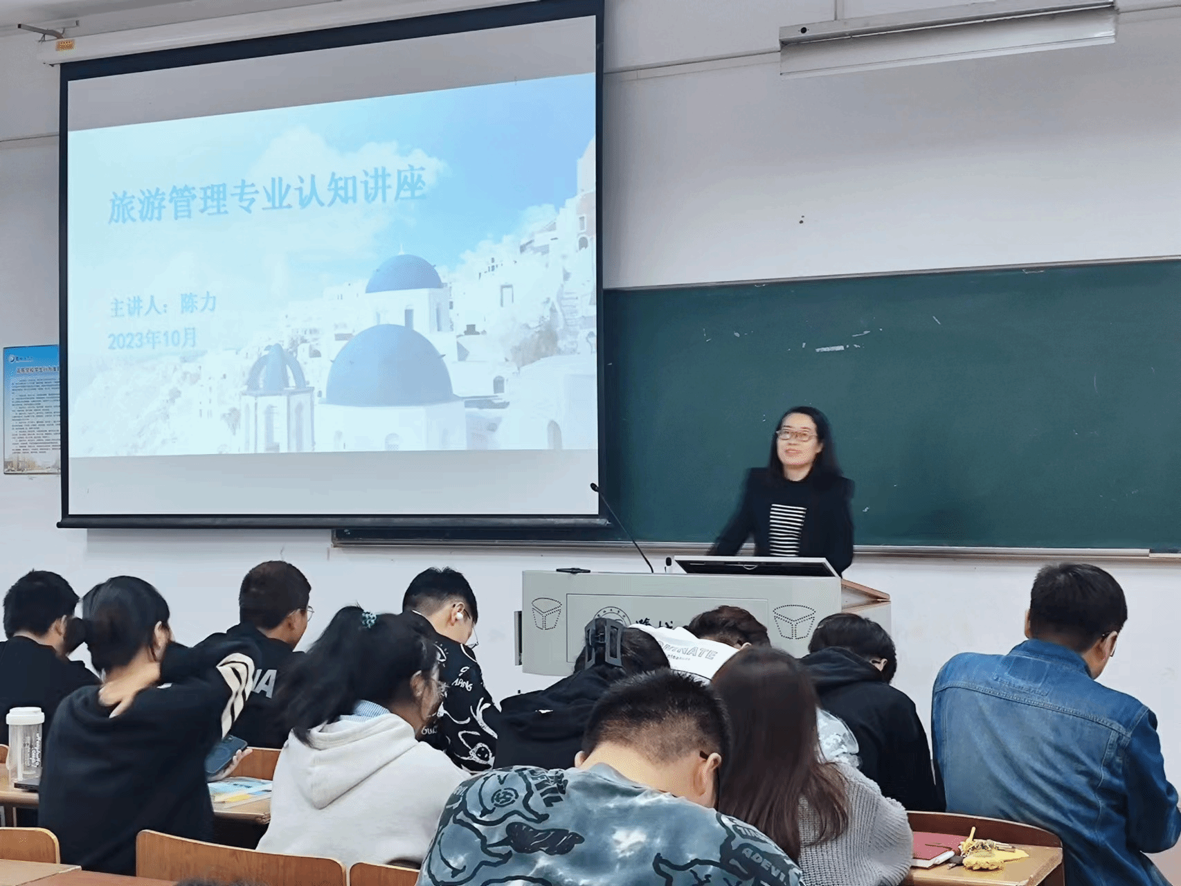 陈力围绕旅游管理专业发展历程、专业课程模块设置等方面向同学们展开全面细致的介绍,并分析了当下新兴旅游业态快速发展下的就业前景,鼓励同学们课余时间主动了解旅游行业动态,努力学习专业知识,同时要努力克服惰性,大胆走出舒适区。未来要加强理论与实践的融合,积极参与全国旅游院校服务技能大赛、全国老员工课外学术科技作品竞赛等高含金量竞赛项目,能以赛促学、以学促用。她希望同学们秉持为他人服务的职业理念奋发图强,未来投身到以旅游、文化、养老等产业为代表的“幸福产业”之中。
