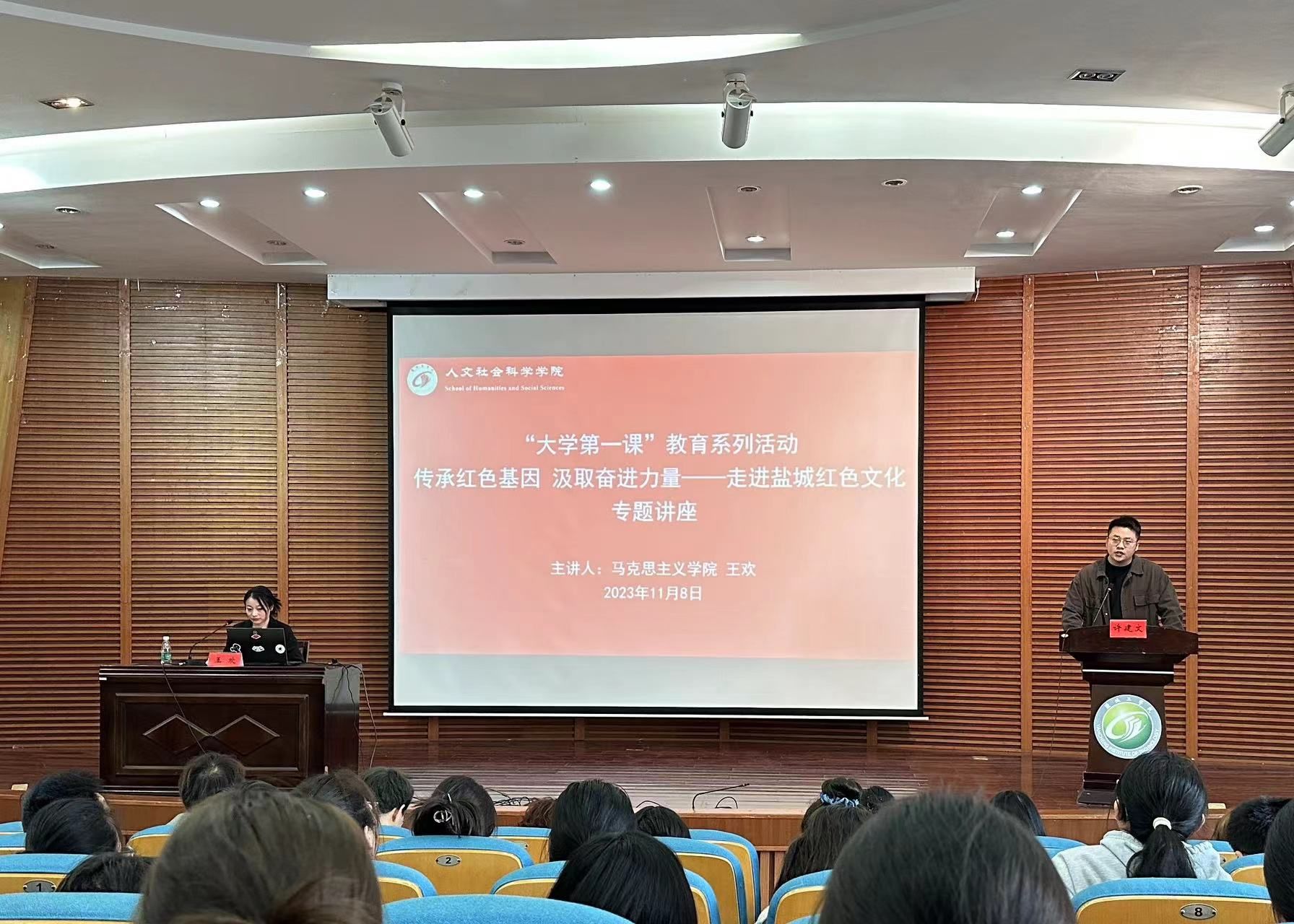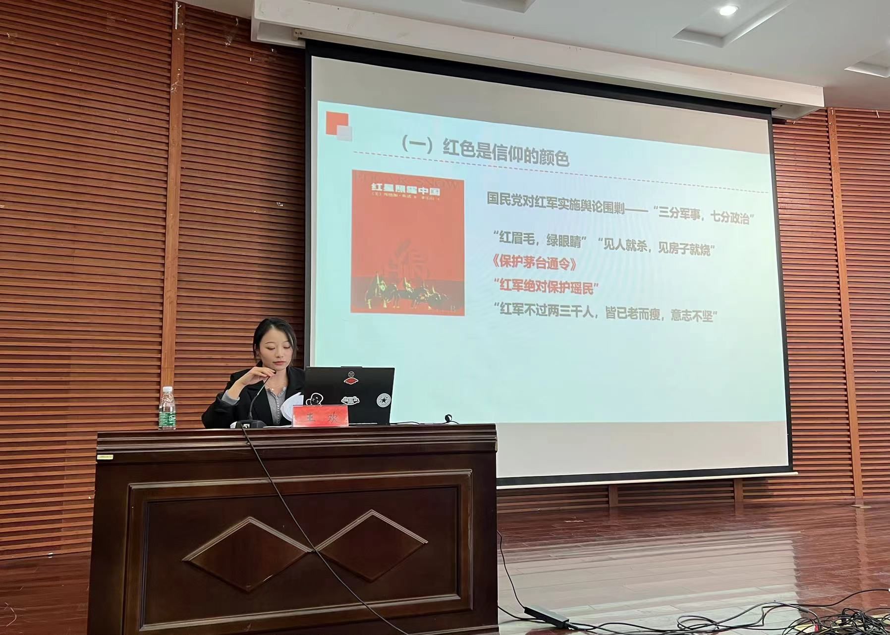 王欢以“传承红色基因 汲取奋进力量——走进盐城红色文化”为主题,向同学们解读了红色文化的由来,从内涵特征、历史演进等方面详细介绍了盐城红色文化的发展历程。她表示,盐城红色文化是在中国共产党领导下,盐城地域革命斗争的历史以及所凝结而成的一种独特精神,是物质与非物质的一种共生形态。她呼吁同学们要大力弘扬红色文化,将红色基因的强大凝聚力内化于心,将中国共产党人传承的优秀品质外化于行,用红色基因砥砺自己的志气、骨气、底气,为全面建设社会主义现代化强国贡献青春力量。