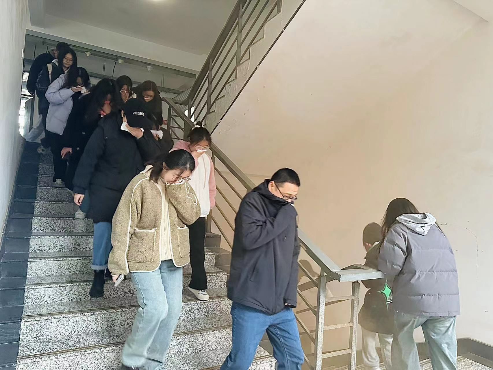 演练中,师生们沉着冷静,用湿毛巾捂住口鼻,弯腰从消防通道逃生。整个疏散过程有条不紊、井然有序,从指定楼层5分钟内完成安全撤离,达到了消防演练预期效果。