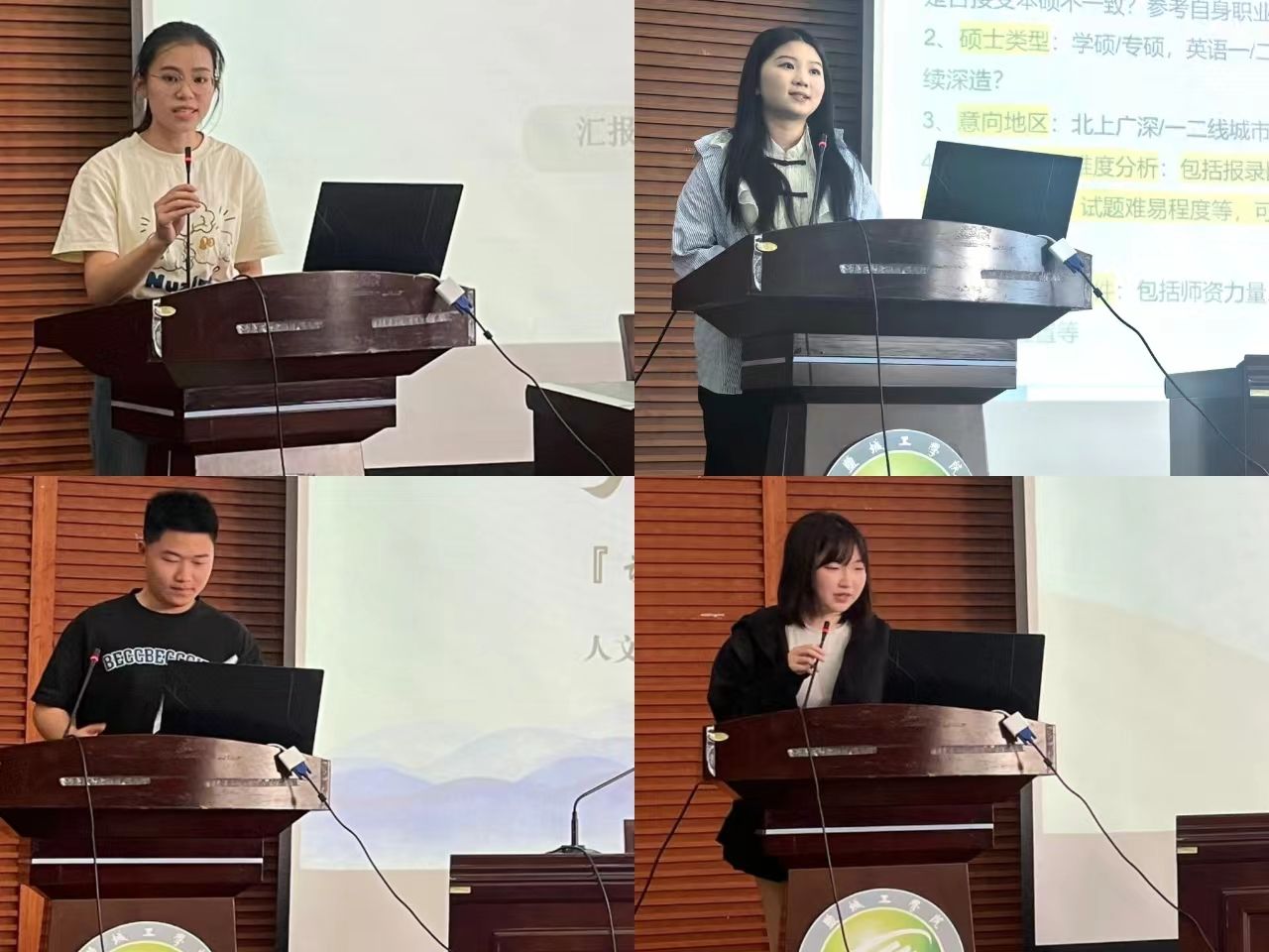 会上,考取四川农业大学、B酒店201班朱丽瑛同学以自己考研的经历为基础,从择校、初试、复试这三个角度进行讲解,提醒同学们要脚踏实地,厚积薄发并祝愿2021级考研学子金榜题名,高分上岸;考取南京工业大学、B旅游203班仇豫晗同学从个人情况、备考经验这两个方面展开讲述,引导同学们要保持好心态、注意劳逸结合、坚持到底,她鼓励学弟学妹们“把书背烂,把题刷烂,克服苦难,一定上岸!”;考取西北民族大学、W中文201班花勇同学结合自身的调剂经历从调剂原因、调剂择校、调剂复试三个方面向大家进行考研调剂的讲解,并鼓励大家不要轻言放弃,坚持就是胜利!考取澳大利亚悉尼大学、B中文201班沈魏佳同学给同学们分享了海外申硕的相关知识,鼓励更多同学拓展国际视野,提升留学申硕的信心,提前做好时间规划,申请到理想的硕士院校。