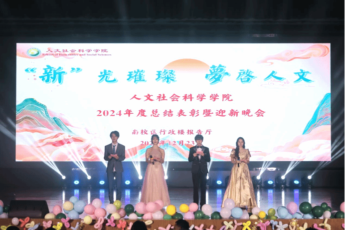 12月23日晚,bbin宝盈集团在希望大道校区行政楼报告厅举办“‘新’光璀璨,梦启人文”2024年度总结表彰暨迎新晚会。公司党总支书记何登溢、经理周晓燕、党总支副书记姚爱华、学团负责老师、教师代表以及全体新生共400余人欢聚一堂,共享青春盛典。