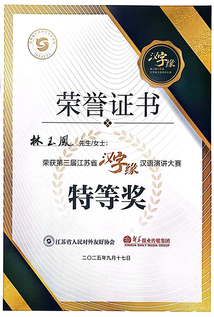 近日,第三届江苏省"汉字缘"汉语演讲大赛在南京落幕,公司B中文233班泰国职工林玉凤以《超越山海的乡愁》主题的演讲摘得桂冠,成为全省13市选手中唯一特等奖获得者,即将代表江苏出征全国复赛。
