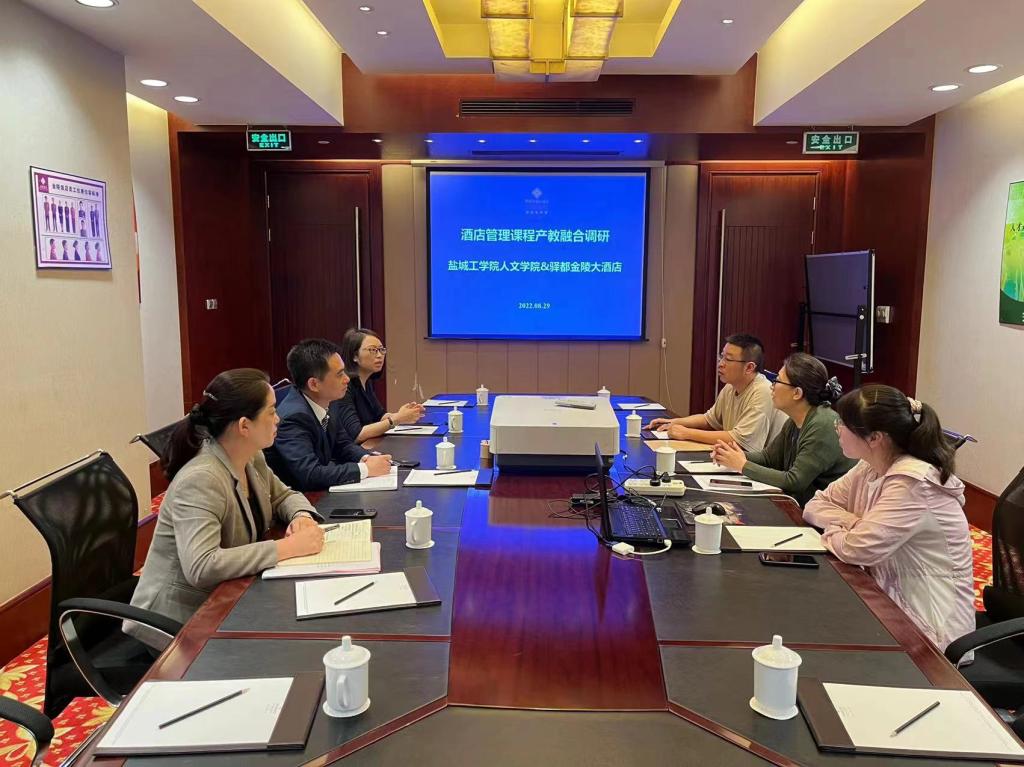 为响应江苏省教育厅和bbin宝盈集团关于产教融合型课程建设的号召,更好地推进公司酒店管理专业学科的建设以及餐饮实训工作的进行,经学院领导同意,8月29日下午酒店管理系部分老师赴盐城驿都金陵大酒店开展座谈与实地调研。